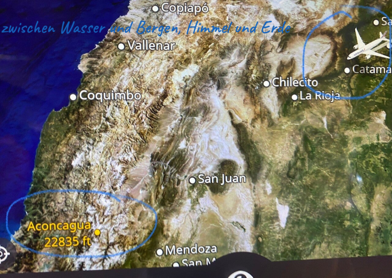 Lange dauert der Flug über das Meer. Lange dauert der Flug über den neuen alten Kontinent Lateinamerika. Brasilien, Argentinien, Paraguay. Endlich kommen die Anden in Sicht und die Namen der Städte werden vertrauter. Der andere Ozean, der Pazifik kommt ins Bild auf dem Bildschirm. Ich freue mich aufs Ankommen. Nun will ich keine Filme mehr sehen, auch wenn die Auswahl aus allein 60 Filmen der letzten drei Jahre enorm ist und mir die Nacht verkürzten.