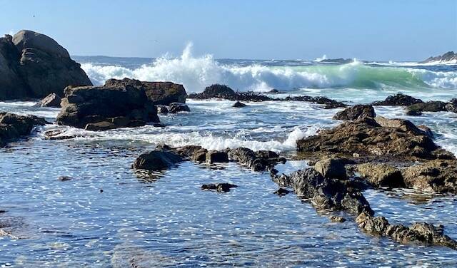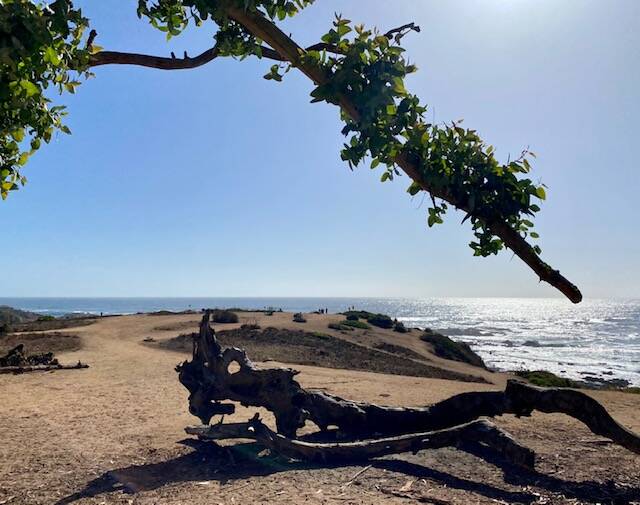 Das Meer zieht an. Das ewige Spiel der Wellen. Der Pazifik hat Kraft und kann selbst im seichten Wasser die Füße wegziehen. Ich kann mich nicht sattsehen an den Wellenbergen und -tälern und beginne den Gesang der Steine am Spülsaum zu hören. Die Freude am Entdecken von Licht und Schatten, Baumstrukturen und den trockenen Duft der wild wachsenden Kräuter sauge ich ein und möchte ich teilen. Mir wird gerade deutlich: So oft nehme ich die Ungleichzeitigkeit in der alltäglichen Ausdifferenzierung wahr, jetzt darf ich Gleichzeitigkeit erleben und genießen.